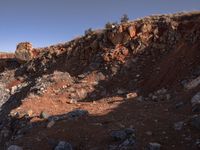 A rugged dirt road winds through the mountainous landscape of Shangri-La in Yunnan, China. The off-road track is surrounded by Mars-like rock formations and a clear sky above.