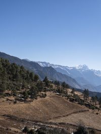 Aerial view of the Shangri-La region in Yunnan, China. Snowy peaks of the Alps mountain range stand tall against a clear sky. Horses graze on dry grass in the rural highlands, surrounded by snowcapped trees.