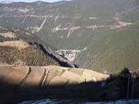 Aerial view of Shangri-La, Yunnan, China in winter. The clear sky frames the elevated landscape, with snow-covered mountains and valleys stretching as far as the eye can see. A bridge spans the wide valley, revealing the rural beauty of this high mountain region.