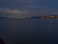 a boat sailing in the water at night with a city lights in the background on a cloudy day