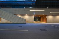 a building at night with light streaming through the windows, lights and stairs to a parking garage