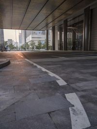 the sidewalk outside of a building and a person on a bicycle in the middle of the street