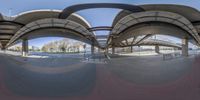 A skate park in Barcelona, Spain, nestled under a freeway bridge with an overpass. The urban design features concrete ramps, benches, and a symmetrical layout. The park provides a vibrant city life experience in Europe's metropolitan area.