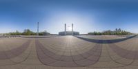 a fisheye lens view of the skate park outside a building that has a fountain in the middle
