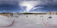 a group of skateboards ride on a ramp at a skate park under construction with clouds in the sky