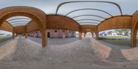 An overcast day at a skate park in Shanghai, China. The circular design features arches and brick pillars, creating a modern and urban atmosphere. The multicolored skate surface adds vibrancy to the space.