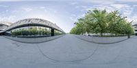 the skateboarder is balancing his board on the ramp at the skate park that overlooks a large arched building in front