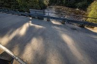 A skateboard sits on top of a railing over a river near a sidewalk and a walkway in Toronto, Ontario, Canada. The landscape features water, a bridge, and lush vegetation. The composite material skateboard contrasts with the natural elements. The image captures the urban design and concrete street of Toronto. The composition includes tints and shades, with shadows creating a sense of depth. The elevated view presents a top-down perspective, showcasing the Armco barrier and guard rail. The road surface is made of asphalt and tar, while grass and trees provide greenery alongside the thoroughfare.