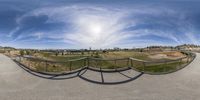 A skateboard ramp at an outdoor park provides a panoramic view of the cityscape in the distance. The clear sky contrasts with the urban architecture. The wood floor and brick wall add a touch of natural elements to the modern cityscape.