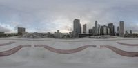 a skateboard park with a lot of ramps and the skyline of los behind it