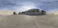 a skateboard park in a city with buildings and blue skies in the background with some clouds