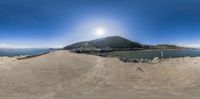the skateboard is very high up near a beach near a large lake and some mountains