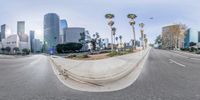 a skateboarder going down the sidewalk in a cityscape scene with palm trees
