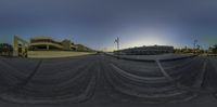 an aerial view of a skateboarder doing tricks at dusk on the outside of the skate park