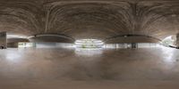the skater is going on his skate board in a half pipe like building with high ceilings