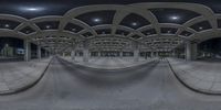 Skateboarder performing tricks in a monochrome indoor space with concrete arches. Overhead perspective view adds depth to the urban landscape. Symmetry and patterns create a visually striking environment.
