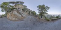 A skateboarder performs a trick on an elevated mountain road in Mallorca, Balearic Islands. The coastal landscape provides a stunning backdrop, with clear skies and panoramic views of the ocean. The fisheye lens adds a unique perspective to the high-speed action.