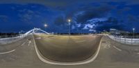 Skateboarder mid-air at night in an empty park. The cityscape of Zaragoza, Spain serves as a modern backdrop with its architectural bridges and urban design. Artificial lights illuminate the scene.
