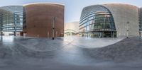 the reflection of a skateboarder on a ramp at an outdoor park area in front of some buildings