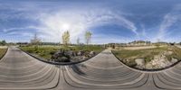 a 360 - view of a skate boarder at the top of a ramp next to rocks