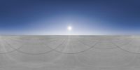 Skateboarder riding the side of a ramp at a skate park during dawn. The sun is visible in the clear sky, creating a sunny and vibrant landscape. Concrete surface provides an open space for tricks and stunts.