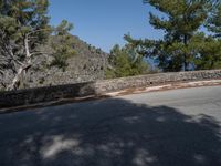 A skateboarder rides on a small paved road near the mountainside in front of some trees. The road stretches along the beautiful coastal line of Mallorca, a stunning island located in the Balearic Islands of Spain. The landscape offers breathtaking views of the ocean with clear skies above. This vibrant image captures the exhilaration of the skateboarder as they navigate the smooth asphalt road on a sunny day, surrounded by the splendor of nature in Europe.