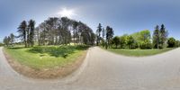 A skateboarder glides down an asphalt road in Ontario, surrounded by lush green grass and open space. The clear sky and rural landscape create a serene and natural setting. Experience the beauty of nature in Toronto.