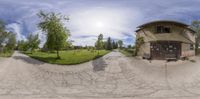 a person riding a skateboard on top of a cement surface in front of a house