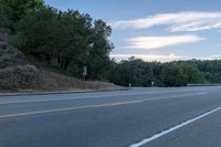 A skateboarder rides past some hills along a rural roadway on a cloudy day in the distance. The road surface is made of asphalt and tar, providing a smooth path for the skateboarder. The landscape is adorned with trees and vegetation, adding to the natural beauty. The hilly terrain offers a thrilling slope for the skateboarder to enjoy their ride. The cloudy sky above adds a touch of drama to the scene, creating a unique atmosphere. This image captures the joy of skateboarding in a rural setting during a cloudy dawn.