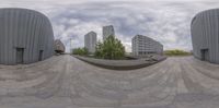 a 360 - shot of a skate boarder riding on a skateboard ramp outside