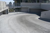 Skateboarder riding on a high road in downtown Los Angeles. Urban cityscape with clear skies and elevated concrete stairs leading to a building. Parking deck and highway ramps add to the urban design.