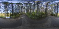 a 360 - image of a skateboarder performing a trick in the woods near trees