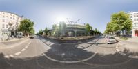 A person skateboarding down the streets of Berlin, Germany. The image captures the vibrant urban atmosphere with its mix of classic and modern architecture, graffiti walls, and street art. The clear sky and compact cars add to the European charm.