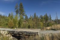 Man riding his skateboard over a broken bridge in the Okanagan Valley, British Columbia. Surrounded by the beauty of nature, the landscape features evergreen trees, a creek, and a clear sky. A perfect day for outdoor adventures in Canada!