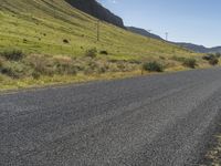 a person riding a skateboard down the middle of a dirt road near grass and mountains