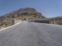 A man on a skateboard rides down a steep road in Mallorca, Balearic Islands. The road, surrounded by majestic mountains and clear skies, offers a breathtaking view of the European landscape.