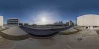 Skateboarder captures an aerial view of the bustling city of Los Angeles. Modern architecture and high-rise buildings dominate the skyline. Clear skies and contrails create a picturesque backdrop for the vibrant urban metropolis.
