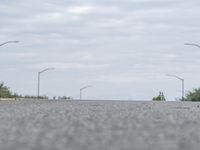 A person is skateboarding across an empty open road with trees in the background at the bottom. The road, made of asphalt, stretches through a rural landscape with fields and grassy areas. The sky is gloomy with grey clouds, creating a moody atmosphere. In the distance, a windmill and wind turbine can be seen. The road surface is smooth, providing a perfect environment for skateboarding. Street lights line the road, illuminating the surroundings. This image captures the feeling of freedom and adventure on an open road.