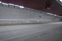 A man skateboarding down an empty concrete street at night. The tunnel in the background illuminated by artificial lights creates a dark and mysterious atmosphere. Grey metal guard rails and a composite road surface add to the urban aesthetic.