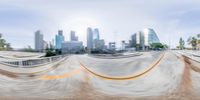Skateboarder glides down a curved ramp in downtown Los Angeles. The city's iconic skyscrapers and high-rises create a stunning cityscape. Asphalt roads and motion blur capture the fast-paced urban life of this metropolitan area.