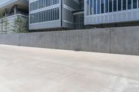 a skateboarder rides a skate board down an empty concrete street near a high - rise office building
