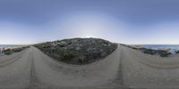 a man riding a skateboard down a ramp near the ocean and a sand hill