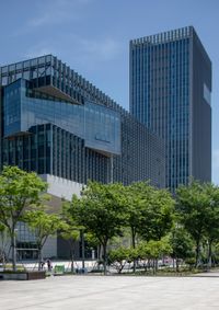 a man riding a skateboard across a plaza next to tall buildings with trees in front of it