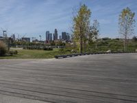 a skateboarder at the edge of a wooden ramp looking at city skylines