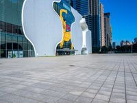 This stock photo captures the unique blend of modern architecture and urban design in the bustling city of Taichung, Taiwan. In the foreground, a statue of a man on a skateboard adds a touch of creativity to the cityscape. The clear sky and open space create a vibrant atmosphere, perfect for city life enthusiasts. The building's entrance showcases the intricacies of the city's architecture, with paver surfaces leading the way. Whether you're a fan of theater or simply enjoy exploring cities, this image embodies the spirit of urban living in Taiwan.