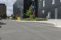 A man is skateboarding down the empty street by himself in Toronto's urban residential area, surrounded by modern apartment buildings and office buildings. The road surface is smooth asphalt, leading through the bustling city. The skyline of Toronto can be seen in the distance, with clouds floating above. The image showcases the vibrant city life and architectural design of this metropolitan area in Canada's largest city.