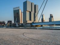A view of a woman skateboarding along the river in Holland, with the city dock in the background. The clear sky and modern architecture create a vibrant urban landscape in Europe.