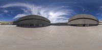 Skatepark in Tenerife, Spain, featuring modern architecture and circular designs. Upside-down view adds an interesting perspective. Clear blue sky and vibrant urban surroundings create a lively atmosphere for skateboarding enthusiasts.