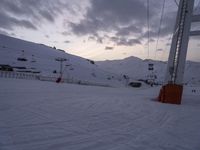 A breathtaking winter landscape at dawn in the French Alps. Snow-covered mountains form a majestic mountain range, with clear skies above. Tourists enjoy skiing on the slopes and taking the gondola to the top for panoramic views.