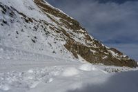 a man riding skis on a snow covered slope next to a steep cliff formation